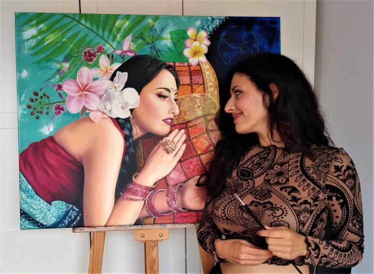 On this occasion the artist opted to mix two very used tones in the Indian clothing, such as pink and orange. The blouse adorned with a flower in carmine de garanza attracts the glance by the fast stroke that contrasts with the diffused brushstroke of the skin.